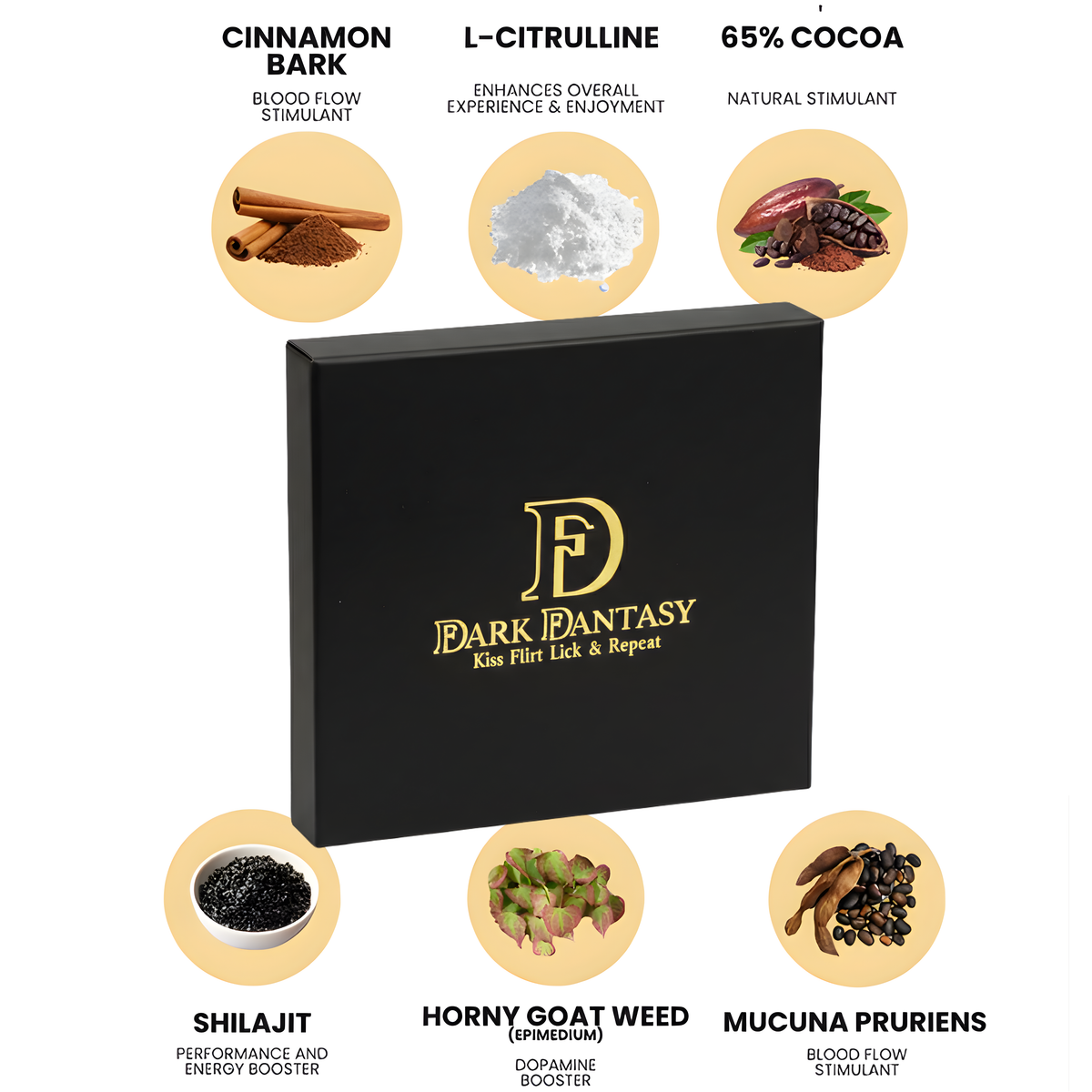 “Dark Fantasy blends premium dark chocolate with powerful natural herbs designed to support energy and vitality.Its unique formula combines traditional botanicals known for enhancing mood, stamina, and overall performance.The Special Edition adds exotic ingredients to create a richer, more memorable shared experience.“